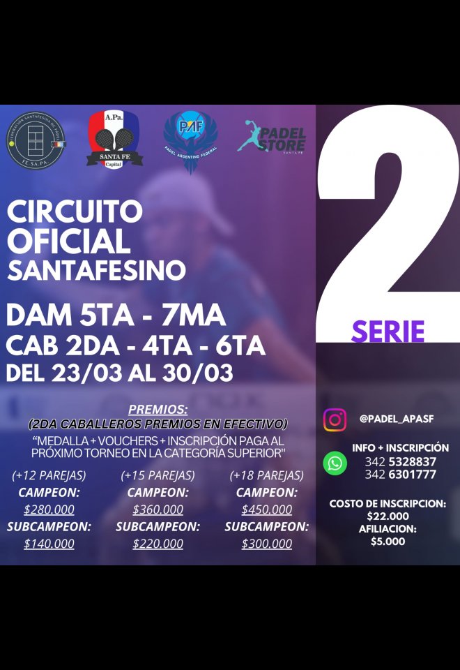 »» Evento: Circuito Oficial Santafesino Serie 2 D5/7 C2/4/6 »» Localidad: Santa Fe »» Fechas: 23/03/2025 al 30/03/2025