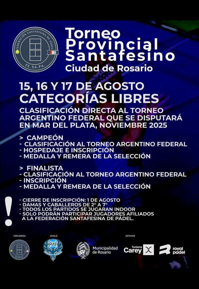 »» Evento: Torneo Provincial de Libres »» Localidad: Rosario »» Fechas: 16/08/2025 al 17/08/2025